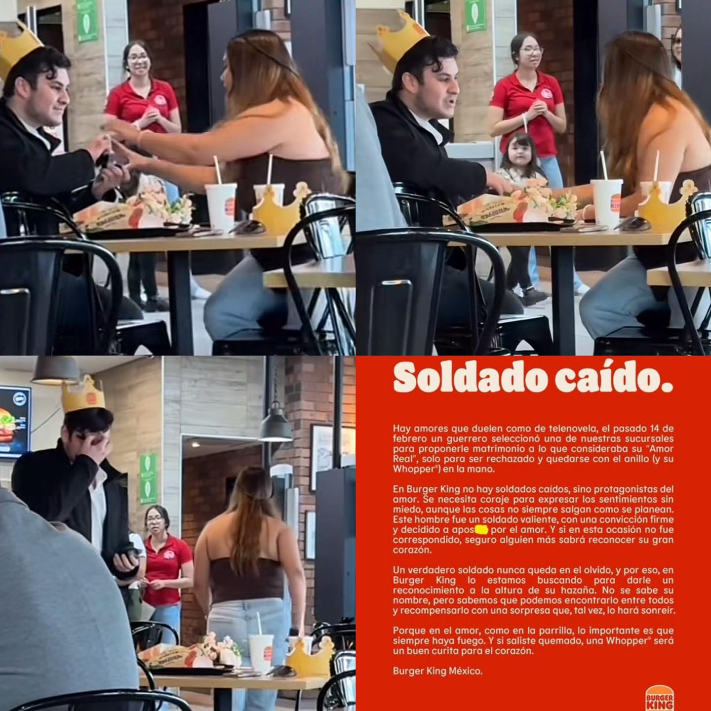 En un Burger King de Monterrey se vivió un emotivo y agridulce momento el pasado Día de San Valentín. Un joven, luciendo una corona de cartón y portando un ramo de flores, se arrodilló para pedirle matrimonio a su novia, desplegando ante ella una sortija. Sin embargo, la respuesta fue inesperada, la joven rechazó la propuesta, cerró el estuche del anillo, devolvió el ramo y se retiró tras mantener una larga conversación con él.