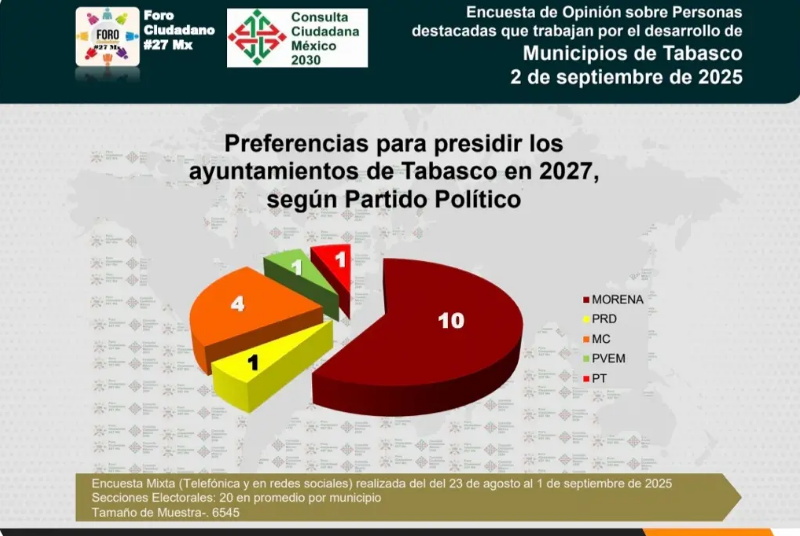 MORENA GANARÍA 10 AYUNTAMIENTOS DE TABASCO, ASEGURA ENCUESTA DE FORO CIUDADANO