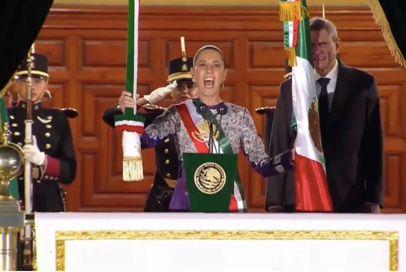 A las 23.00 horas la presidenta mexicana salió al balcón central de Palacio Nacional con la bandera mexicana, previamente portada por cadetes mujeres. Cabe destacar que la banda presidencial que porto fue confeccionada por la Dirección General de Fábricas de Vestuario y Equipo de la Secretaría de la Defensa Nacional (Defensa).