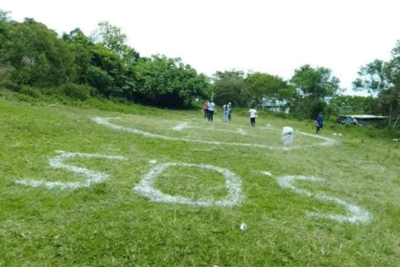 Sobre un terreno visible desde la distancia, pobladores de la comunidad La Esperanza Número 1, en Huehuetla, Hidalgo, pintaron la leyenda de auxilio “SOS”, solicitando víveres, agua, electricidad y medios de comunicación, pues carecen de estos servicios y están incomunicados debido a las lluvias registradas la semana pasada.