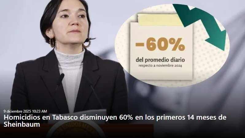 HOMICIDIOS EN TABASCO DISMINUYEN 60% EN LOS PRIMEROS 14 MESES DE SHEINBAUM