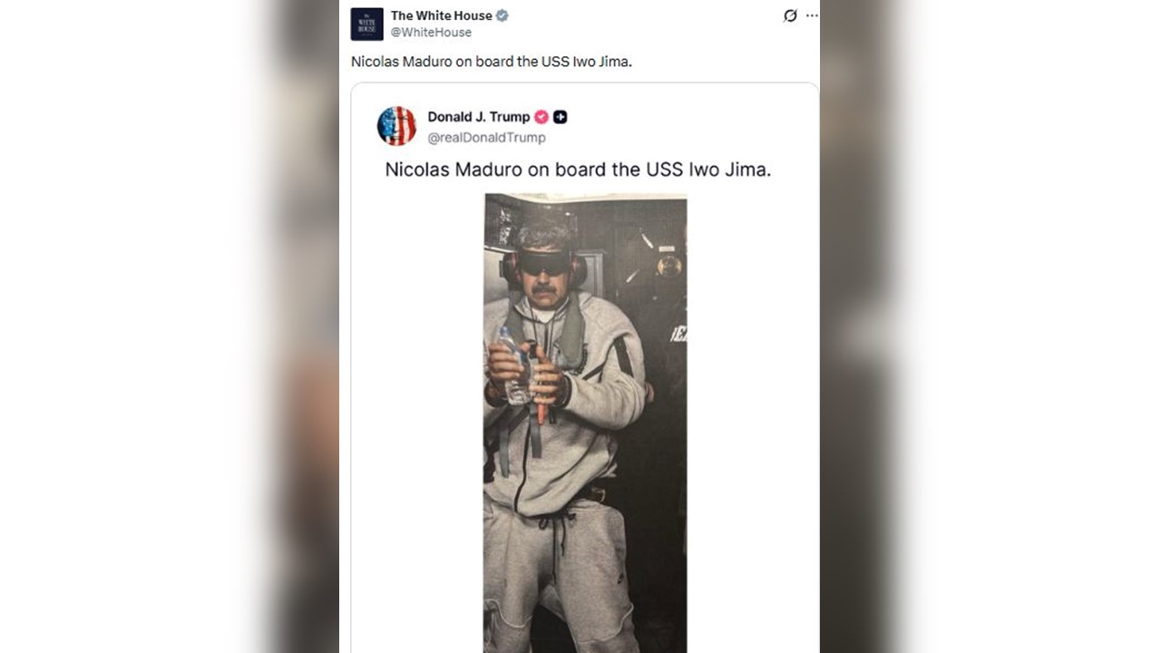 LA CASA BLANCA HA PUBLICADO LA PRIMERA IMAGEN OFICIAL DE NICOLÁS MADURO CAPTURADO. Navegación de entradas DONALD TRUMP AFIRMA QUE “ALGO TENDRÁ QUE HACERSE CON MÉXICO” TRAS OPERACIÓN CONTRA MADUROONU HACE UN LLAMADO AL DIÁLOGO ENTRE VENEZUELA Y ESTADOS UNIDOS