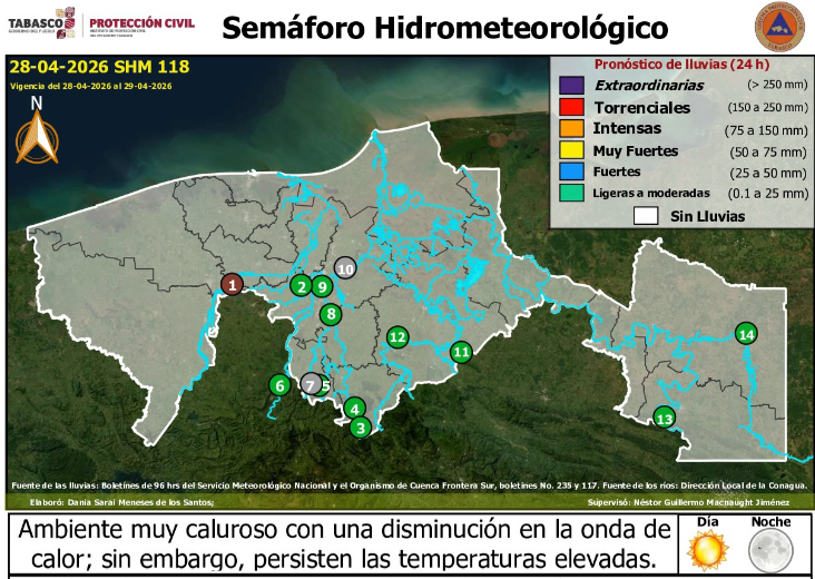 Persistirá un ambiente muy caluroso con cielo mayormente despejado durante el día. Asimismo, la onda de calor que ha afectado al Estado tendrá una disminución en su intensidad. Sin embargo, aún se mantendrán temperaturas elevadas, esperando las máximas entre 36 °C a 41 °C, así como sensaciones térmicas entre 35 °C y 45 °C, con las más altas esperadas al occidente y centro.